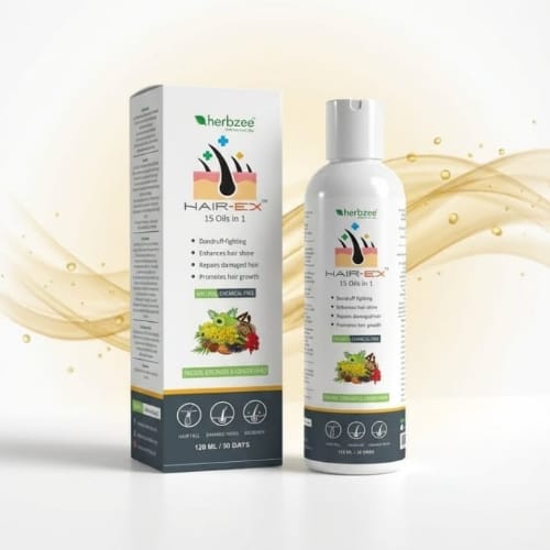 HerbZee Hair-Ex is a powerful blend of 15 pure herbal extracts and oils designed to nourish the scalp, support hair growth, reduce dandruff, minimize hair fall and restore natural shine โ a 100% natural, chemical-free formula suitable for everyday use.